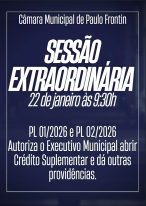 CONVOCAR os Excelentíssimos Senhores Vereadores para a Sessão Extraordinária a ser realizada no dia 22 de janeiro de 2026 (quinta-feira), às 09:30 horas na Câmara Municipal de Paulo Frontin-PR.