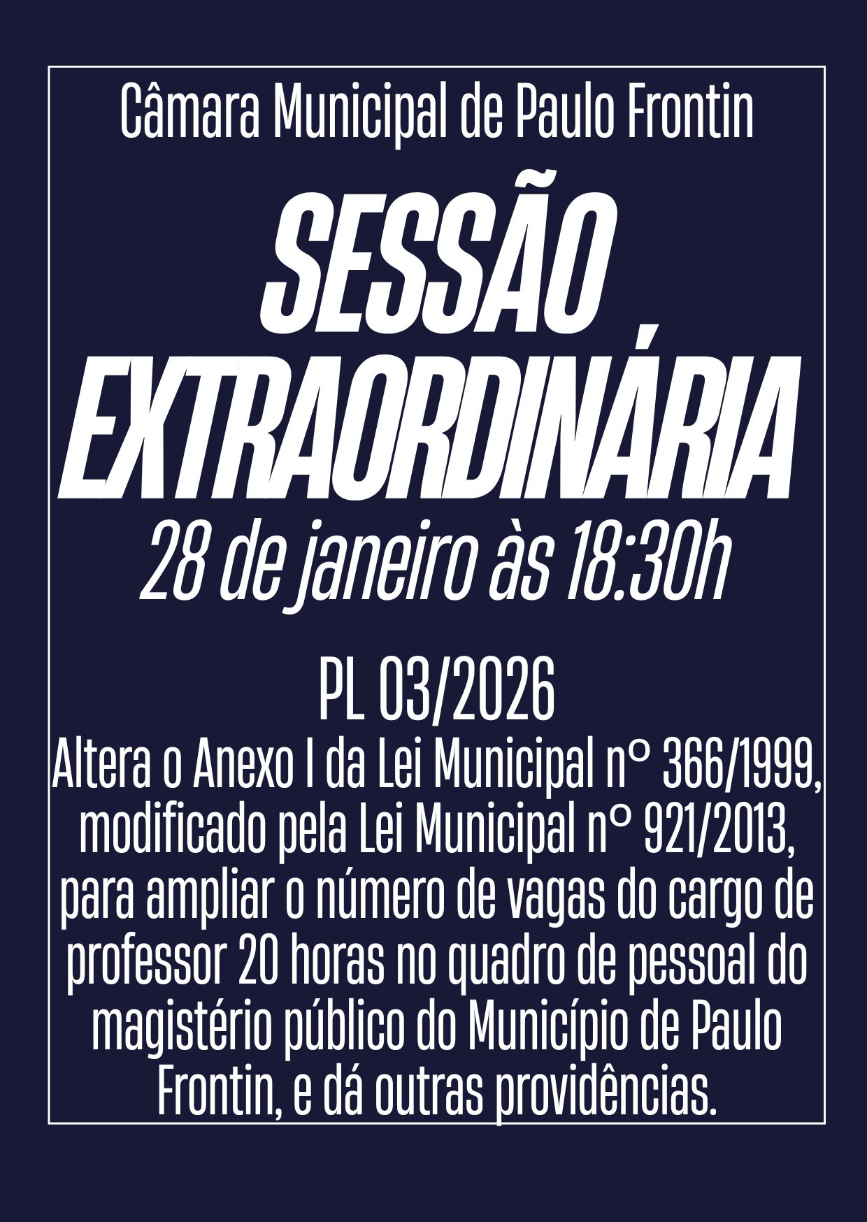CONVOCAR os Excelentíssimos Senhores Vereadores para a Sessão Extraordinária a ser realizada no dia 28 de janeiro de 2026 (quarta-feira), às 18:30 horas na Câmara Municipal de Paulo Frontin-PR.
